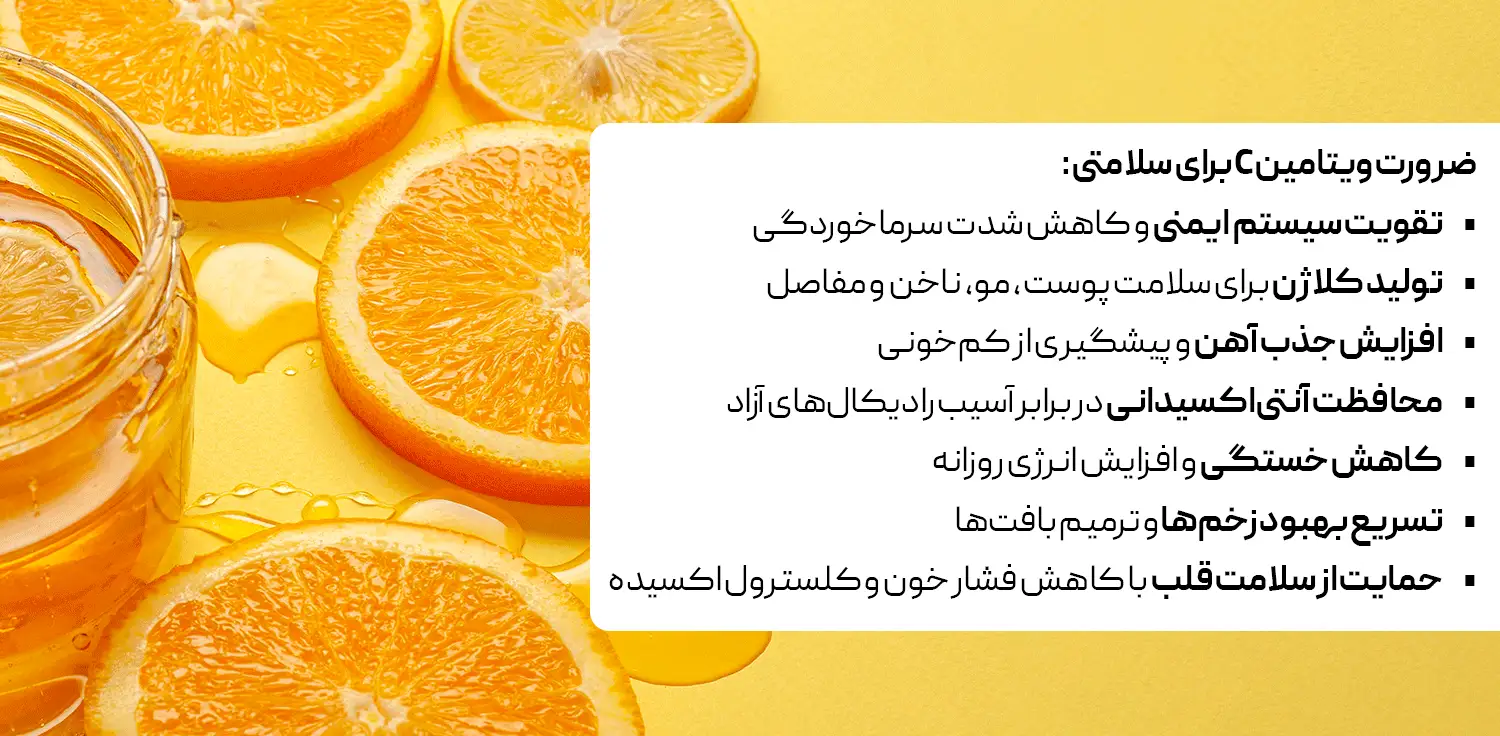 این ویتامین بهعنوان یک آنتیاکسیدان قوی عمل کرده و از سلولها در برابر آسیبهای ناشی از رادیکالهای آزاد محافظت میکند. ویتامین C در تولید کلاژن (برای سلامت پوست، مفاصل و استخوانها)، تقویت سیستم ایمنی، بهبود جذب آهن و کاهش خستگی نقش دارد. همچنین وجود ویتامین سی برای جذب آهن از منابع گیاهی ضروری است. از آنجا که بدن انسان قادر به تولید یا ذخیره طولانیمدت ویتامین C نیست، باید بهطور منظم از طریق رژیم غذایی یا مکملهایی مانند قرص جوشان تأمین شود.