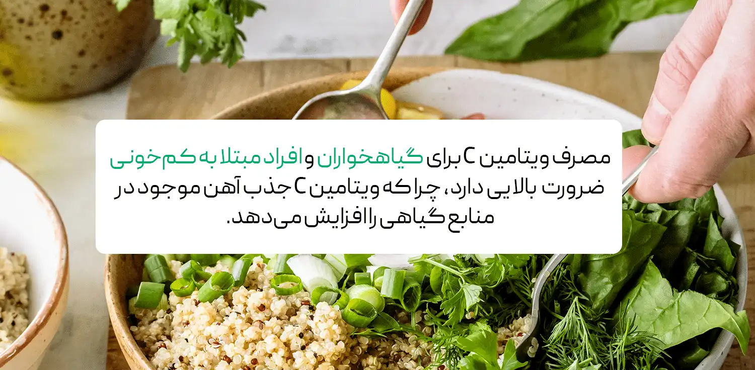 ویتامین C جذب آهن غیرهِم (آهن موجود در منابع گیاهی) را افزایش میدهد. این ویژگی برای افراد مبتلا به کمخونی یا کسانی که رژیم گیاهخواری دارند، بسیار مفید است.